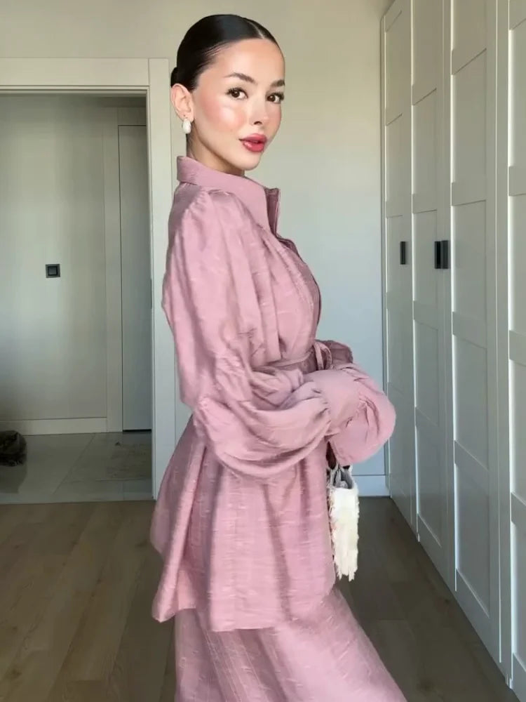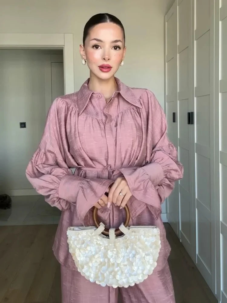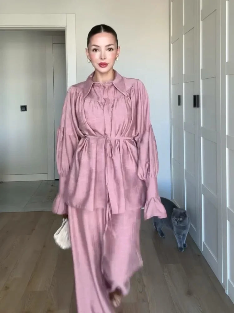 Die locker sitzende Bluse mit subtiler Taillierung und die weiten Hosen schaffen einen eleganten Look, der sich sowohl für entspannte Tage als auch für besondere Anlässe eignet. Dieses Set ist zeitlos, leicht zu kombinieren und ein Must-Have für stilbewusste Frauen.